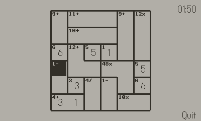 Any feedback, issues, ideas are welcome. Basically, I wrote it for myself, as I like Sudoku and other math puzzle games. If you like Sudoku, KenKen is its arithmetic cousin: fill each row and column with unique digits, but cells are grouped into cages with a target number and operation (like 12x or