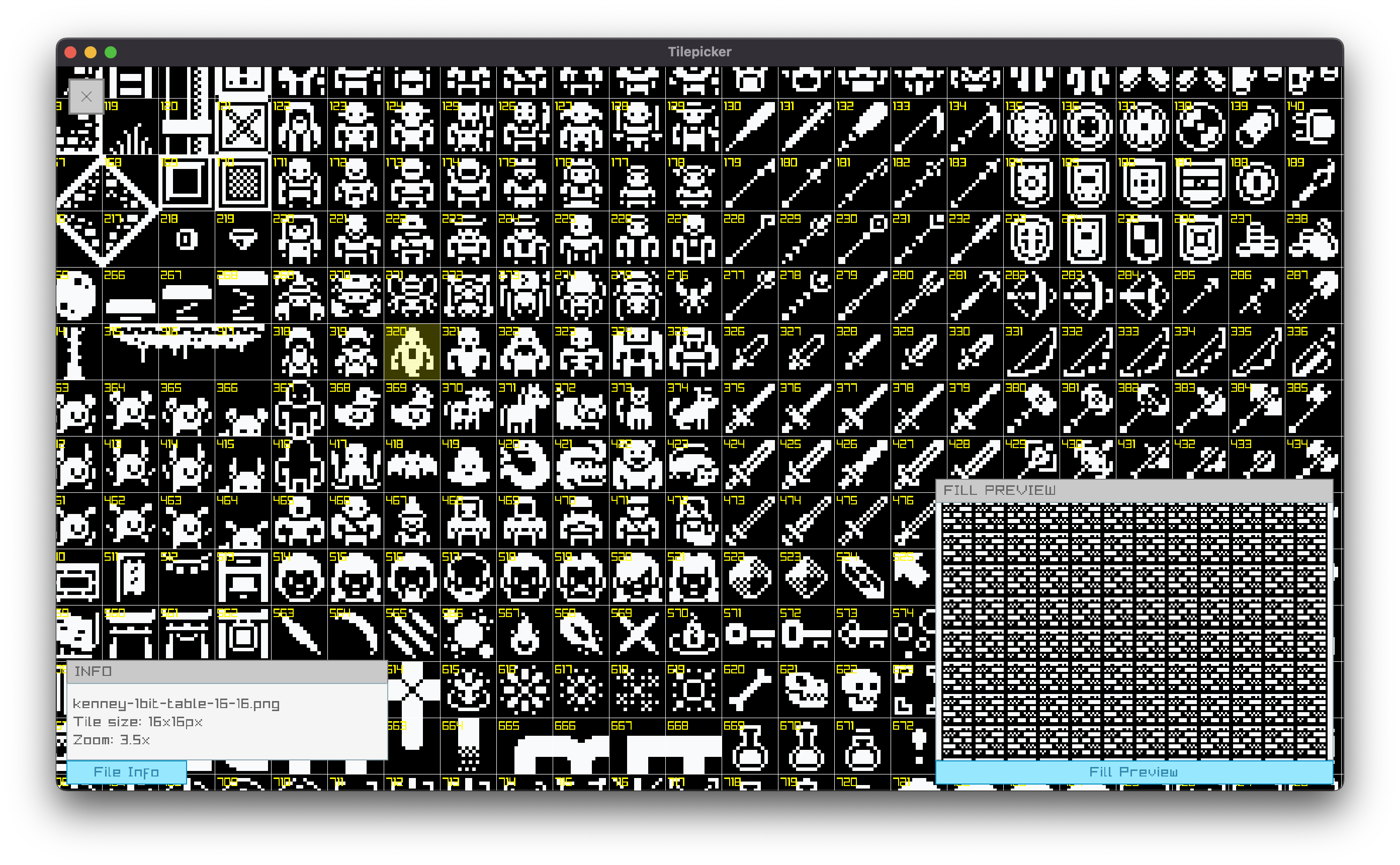 Enigmata uses the Kenney 1-Bit tileset, which is such an amazing public domain resource. I wanted the ability to preview what the tiles look like filling the map, as well as quickly get the tile index. tilepicker lets me pan around the tileset, click an image to get its index, and quickly find what I need.