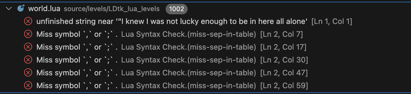 When I build my game, I grab the LDtk_lua_levels file from the data folder and add it to my project in a levels folder. This was working great until today. Now, for some reason I keep getting errors like this where it is having trouble dealing with dialogue strings I have in my game.