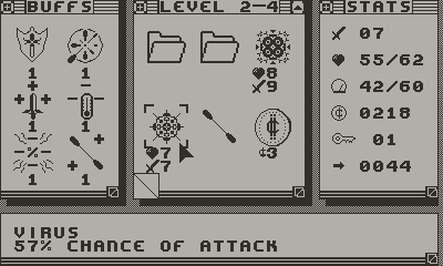 Binary Battle is a novel take on the dungeon crawler genre. You have just woken up to find out your floppy disk is full of viruses! Unfortunately, it contains the only copy source code of the game you have been working on in the past months...