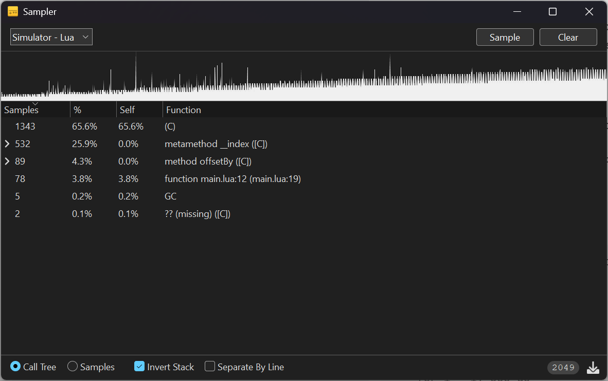 But still framerate was dropping. I tried to use the Sampler and it was obvious that cpu load was growing. And the top most function was some untitled (C) and then it were calls into a native Rect. __index accessing its fields and offsetBy method I was calling several times.