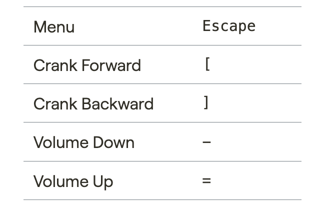 All of the above were tested against 3.0.1. As a workaround it possible to manually remap all of these (except the crank drawer) using the macOS keyboard controls but I'm sure other devs are similarly impacted.