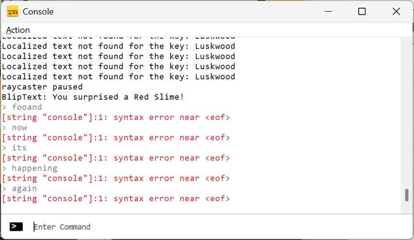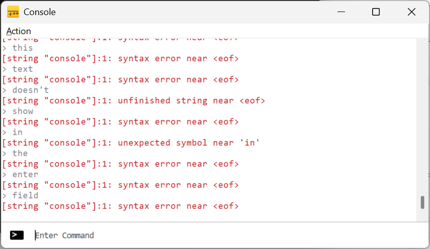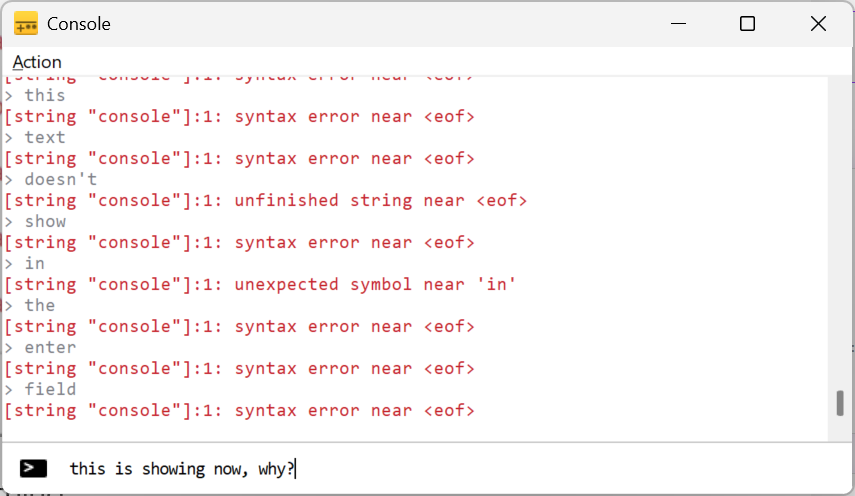 When I type in the ‘Enter Command’ field in the console (as in ‘printTable(foo)’) the keystrokes aren’t shown in the field - so I can’t see what I’m typing - leading to confusion and typos: